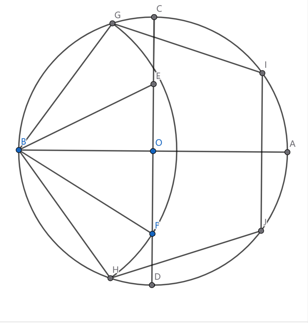 如图,在 \(\odot \, O\) 中,\(AB\) 和 \(CD\) 是互相垂直的两条直径。取 \(CO\) 中点 \(E\),作 \(EF = BE\),且 \(F\) 在射线 \(EO\) 上。以点 \(B\) 为圆心,\(BF\) 长为半径作圆,交 \(\odot \, O\) 于 \(G, H\) 两点,作点 \(I, J\) 在圆上且分别与 \(BG, BH\) 相等。 求证:五边形 \(BGIJH\) 为正五边形。