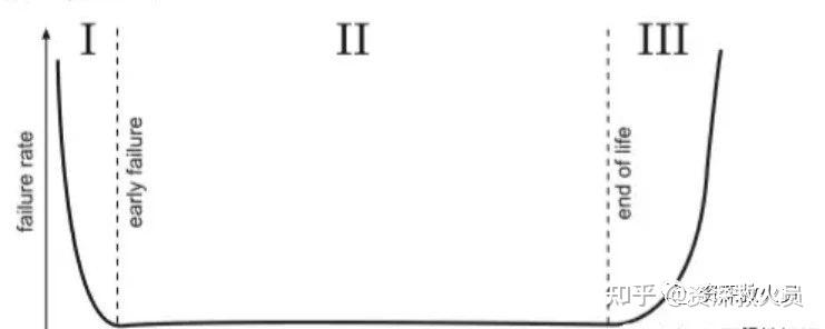浴盆又称失效率曲线,指产品从投入到报废为止的整个生命周期内,其可靠性的变化呈现一定的规律,大致分为早期失效期、随机失效期、损耗失效期。一般认为MTBF是评价的随机失效期Ⅱ。