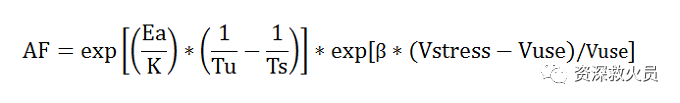 这里AF=e{ Ea/Kb*[1/Tn-1/Ta]}=24.78 (加速因子的具体介绍放在后文,这里记住结果即可)