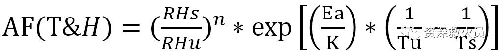 Hallberg-Peck模型综合考虑了温度、湿度影响,是在Arrhenius模型上的延伸。在众多的环境试验中,温度、湿度是最为常见的,同时也是使用频率最高的模拟环境因子。实际环境中温度、湿度也是不可忽略的影响产品使用寿命的因素。Hallberg-Peck模型中的温、湿度加速因子计算模型如下式。