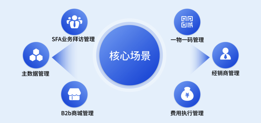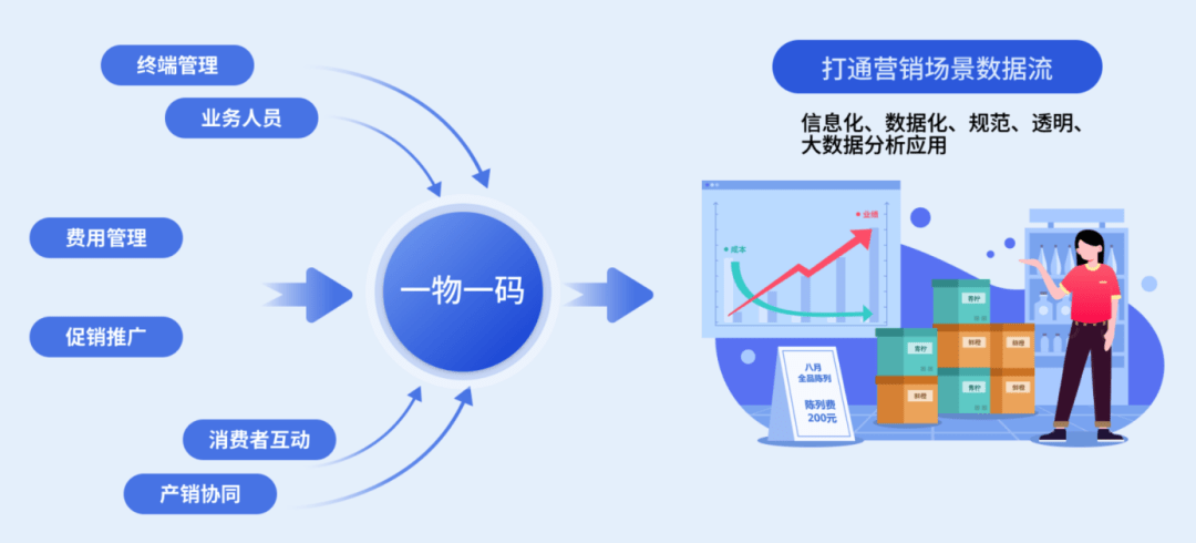 结合快消核心的 SFA、DMS、TPM 业务场景,提供了适应多场景的一键扫码功能,构建了一个集“产品物流、业务流、费用流”于一体的管理体系。这一体系的建立,不仅轻松实现货物流通各链路的信息记录、打通了货物全链路流转中各级角色的连接、有效实现了产品从生产到消费的全生命周期管理,以及产品溯源、防窜货。而基于一物一码扫码链路与 TPM 系统相融合的码营销激励体系,则赋予其灵活激励渠道成员的能力,实现了在分销过程中即时激励的全链路共享式利益分配机制。