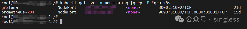root@k8s-master-gpu-1:/# kubectl get svc -n monitoring |grep -E "gra|k8s" ##安装好后查看prometheus和grafana映射的端口