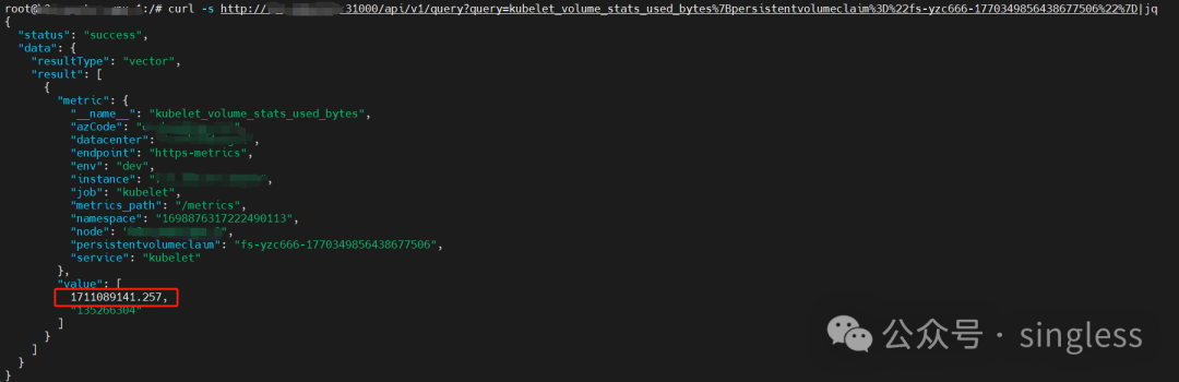curl -s http://localhost:31000/api/v1/query?query=kubelet_volume_stats_used_bytes%7Bpersistentvolumeclaim%3D%22fs-yzc666-1770349856438677506%22%7D