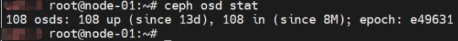 检查OSD健康状态,正常情况下OSDS、UP、IN数量保持一致。