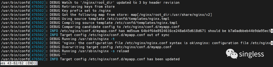 查看confd的日志,可以观察到有配置文件更新的动作