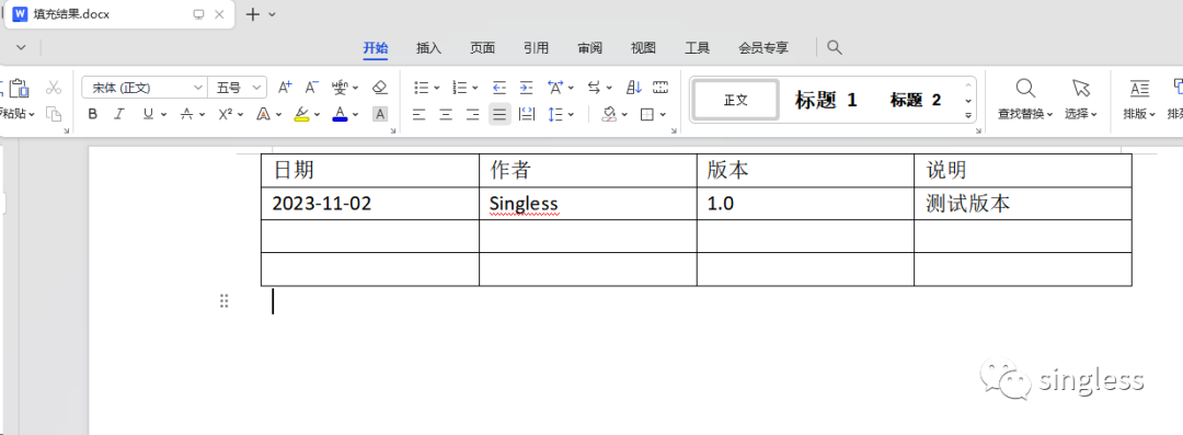 tpl = DocxTemplate(template_doc)context = {"日期": '2023-11-02',"作者": 'Singless',