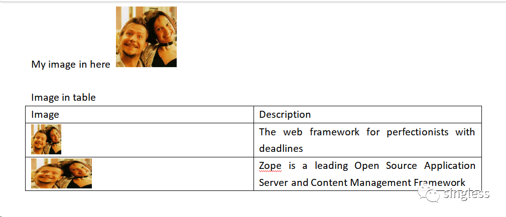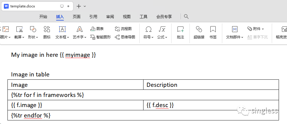 import jinja2tpl = DocxTemplate('template.docx')context = {'myimage': InlineImage(tpl, 'touxiang.jpg', width=Mm(20)),'frameworks': [{'image': InlineImage(tpl, 'touxiang.jpg', height=Mm(10)),'desc': 'The web framework for perfectionists with deadlines',},{'image': InlineImage(tpl, 'touxiang.jpg', width=Mm(20),height=Mm(10)),'desc': 'Zope is a leading Open Source Application Server and Content Management Framework',},],