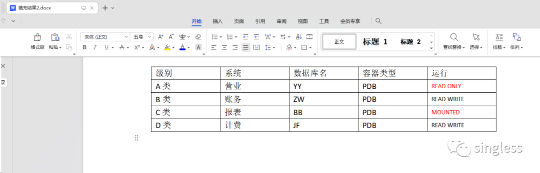 context = {"table": [{ "app_level": 'A类',"app": "营业","db_name": "YY","db_type": "PDB","run": RichText('READ ONLY', color='FF0000', size=16, ), ##通过ricktext方法修改字体颜色和格式},{ "app_level": 'B类',"app": "账务","db_name": "ZW","db_type": "PDB","run": RichText('READ WRITE', color='000000', size=16, ),},{ "app_level": 'C类',"app": "报表","db_name": "BB","db_type": "PDB","run": RichText('MOUNTED', color='FF0000', size=16, ),},{ "app_level": 'D类',"app": "计费","db_name": "JF","db_type": "PDB","run": RichText('READ WRITE', color='000000', size=16, ),},],