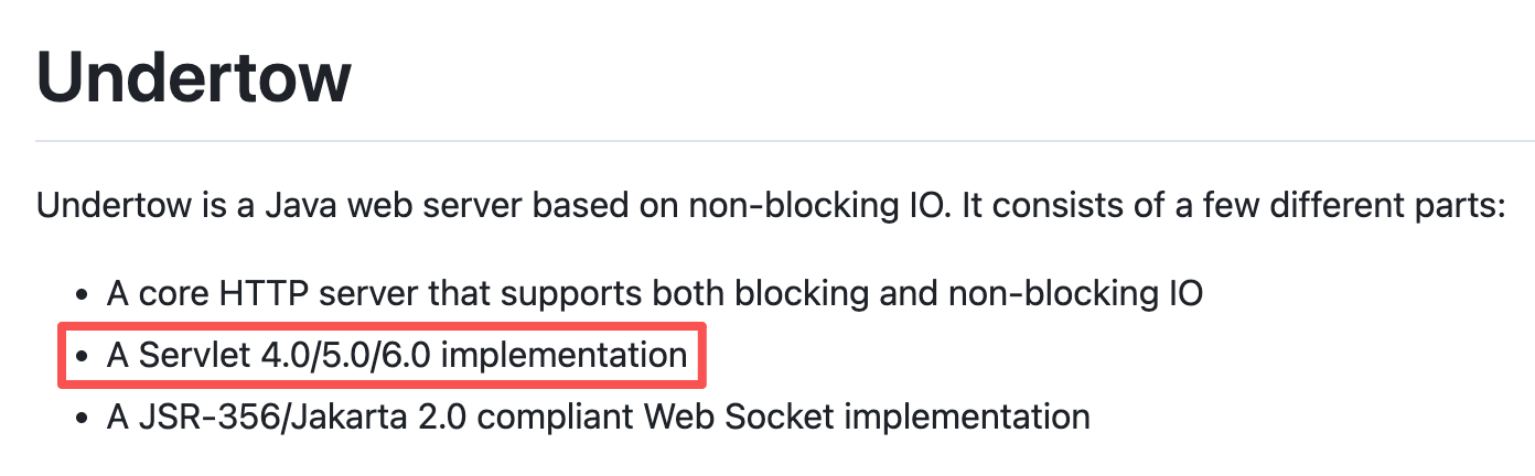 Undertow 是一个基于非阻塞 IO、专门为高性能设计的轻量级 Java Web 服务器,一直是小而美的存在,它是 Tomcat、Jetty 三者中最轻量的一个。