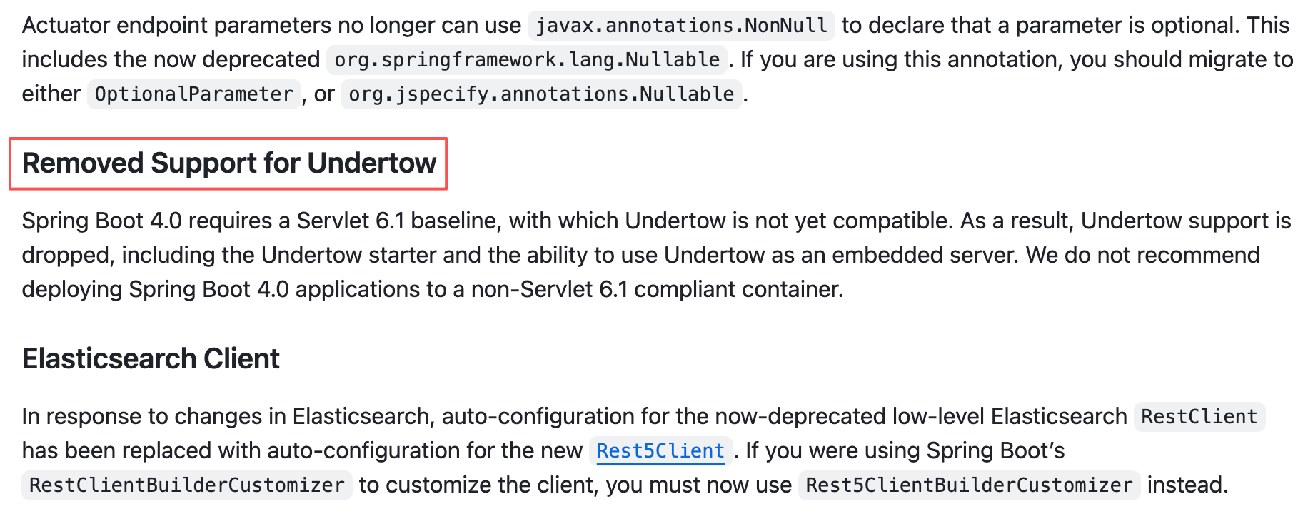Spring Boot 4.0.0-RC1 最近发布了,虽然还没有发布正式版,但从最新的《Spring Boot 4.0 迁移指南》中发现,Spring Boot 4.0 已经移除了对 Undertow 嵌入式 Servlet 容器的支持。