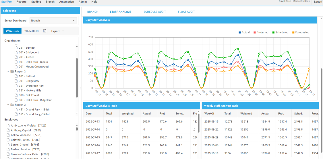 StaffPro® 内置 40+ 标准报表,覆盖员工、网点及运营多维度数据。仪表盘模块由 DHTMLX Charts、Grids、Tables 组件构建,支持 KPI 分析及 CSV 数据导出,为管理层提供直观决策依据。
