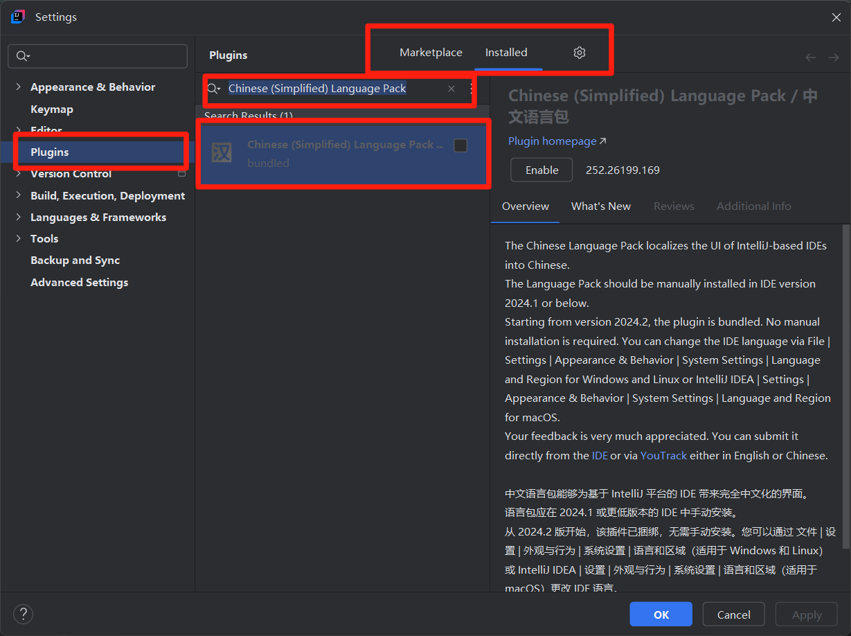安装完毕后进行“Installed”中,找出安装的“Chinese (Simplified) Language Pack”插件,点击“Enable”并重启IDEA后汉化完成