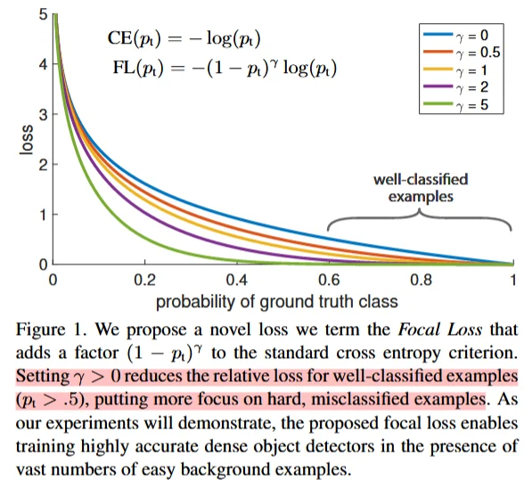 \(\gamma\):调节因子,用于控制对易分类样本的惩罚程度。它是一个非负实数,通常设置为大于 0 的值。当\(\gamma\)>0 时,随着\(p_t\)的增加,\((1-p_t)^{\gamma}\)的值会迅速减小,从而降低易分类样本的损失值。这样可以使得模型更加关注那些难以分类的样本。(换言之,如果样本里面大部分都是A那么计算得到 \(p_t\)也就会越大,那么可以增加 \(\gamma\)值来减小这部分值对于损失值的影响)