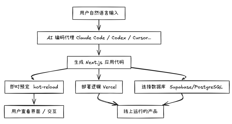 工具割裂、环境配置繁琐:从 Next.js 起步往往得先搭环境、配置数据库、接入 CI/CD、处理部署。 -