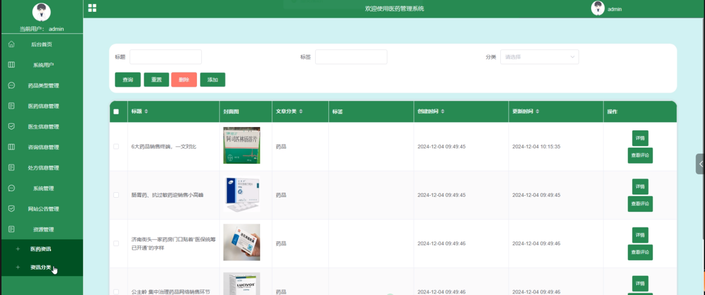 在资源管理模块管理员对医药资讯和资讯分类进行管控,可以对医药资讯和资讯分类信息进行增删改查操作。如点击“医药资讯”管理员可以查看资讯列表中某个资讯的详情和评论信息。点击资讯分类可以查看资讯分类列表信息,点击列表上方的“添加”进入页面填写类型名称信息后点击“提交”即可完毕资讯分类的添加。以医药资讯为例,其界面如下图4-12所示。