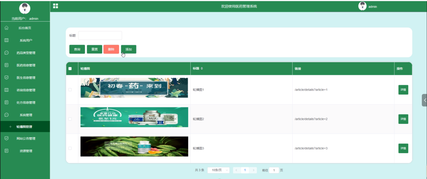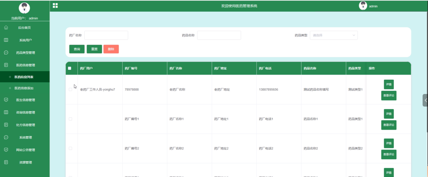 管理员点击“医药信息列表”可以查看医药信息列表中某个医药信息的详情和评论信息,可以对医药信息进行增删改查操作。其界面如下图4-9所示。