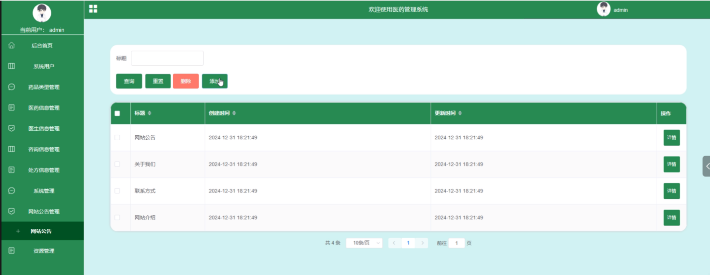 网站公告管理模块是管理员用来管理系统中的网站公告的界面。管理员允许通过该界面进行网站公告的创建、编辑、发布和删除等管理,以便向用户传达各种重要信息、公告、更新或事件等内容。其界面如下图4-11所示。