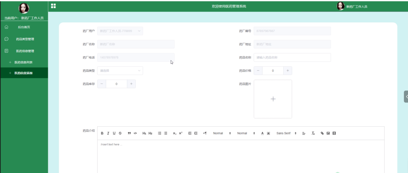 通过用户点击“医药信息列表”可以查看医院信息列表中某个医药信息的详情和评论信息,能够对列表信息进行查询、重置和删除管理。点击“医药信息添加”进入页面填写药厂编号、药厂名称、药厂地址、药品名称、药品价格等信息并上传药品图片后点击“提交”即可完成医药信息的添加。每个药厂用户只能查看和管理自己药厂的医药信息。以医药信息添加为例,其界面如下图4-16所示。