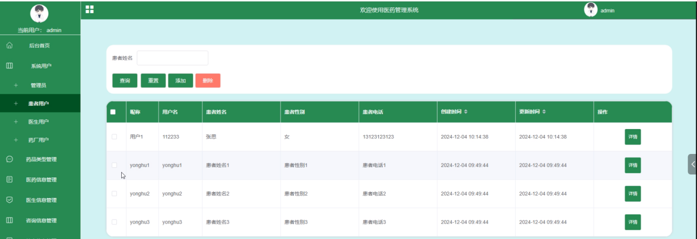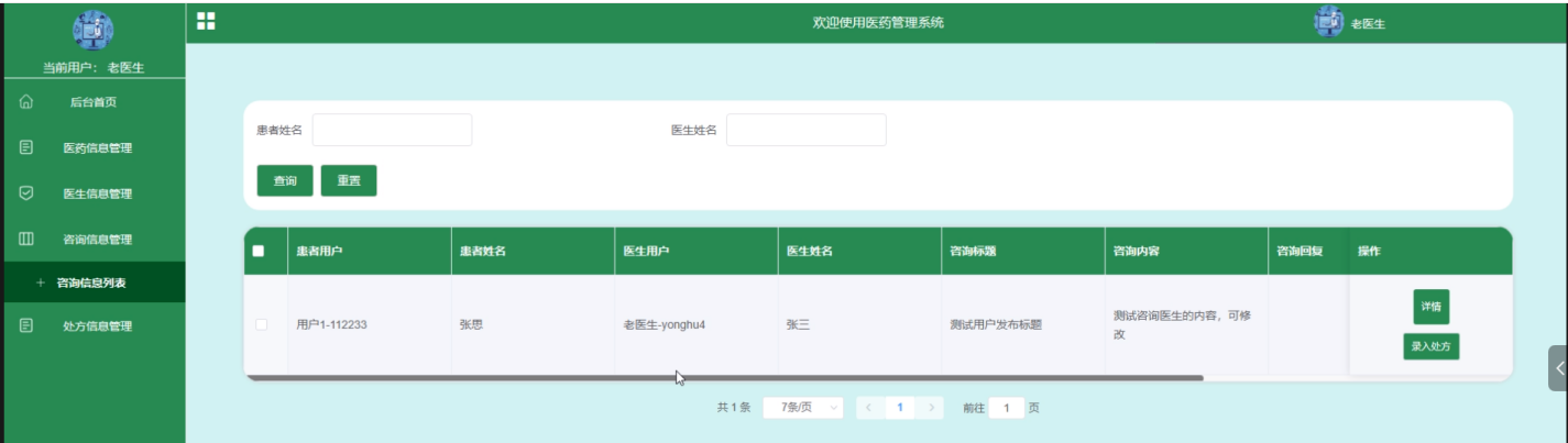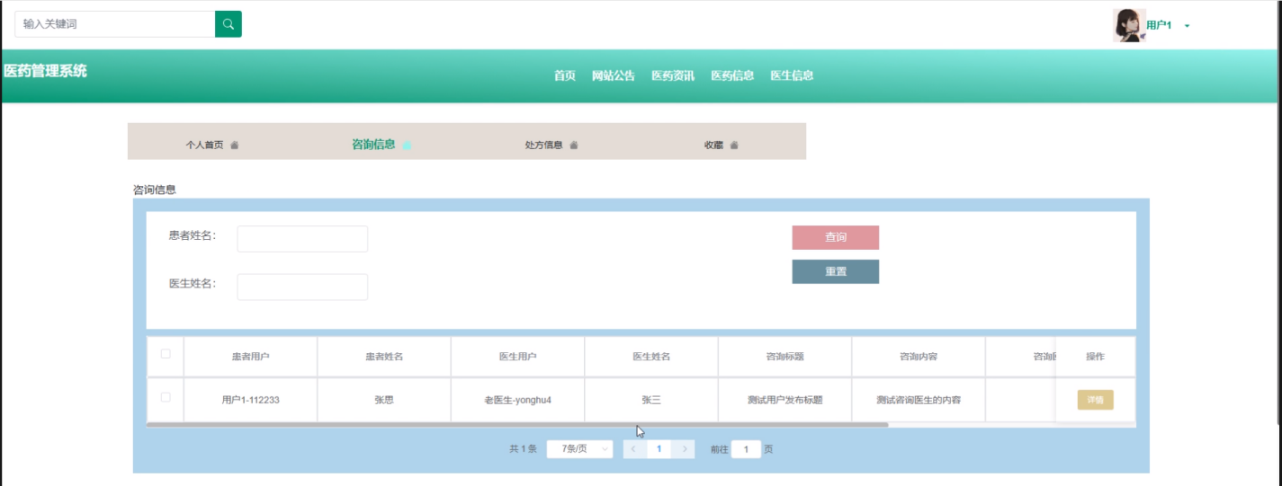 用户可以查看处方信息列表中某个患者用户的处方信息详情,可以对列表信息进行查询和重置操作。其界面如下图4-14所示。