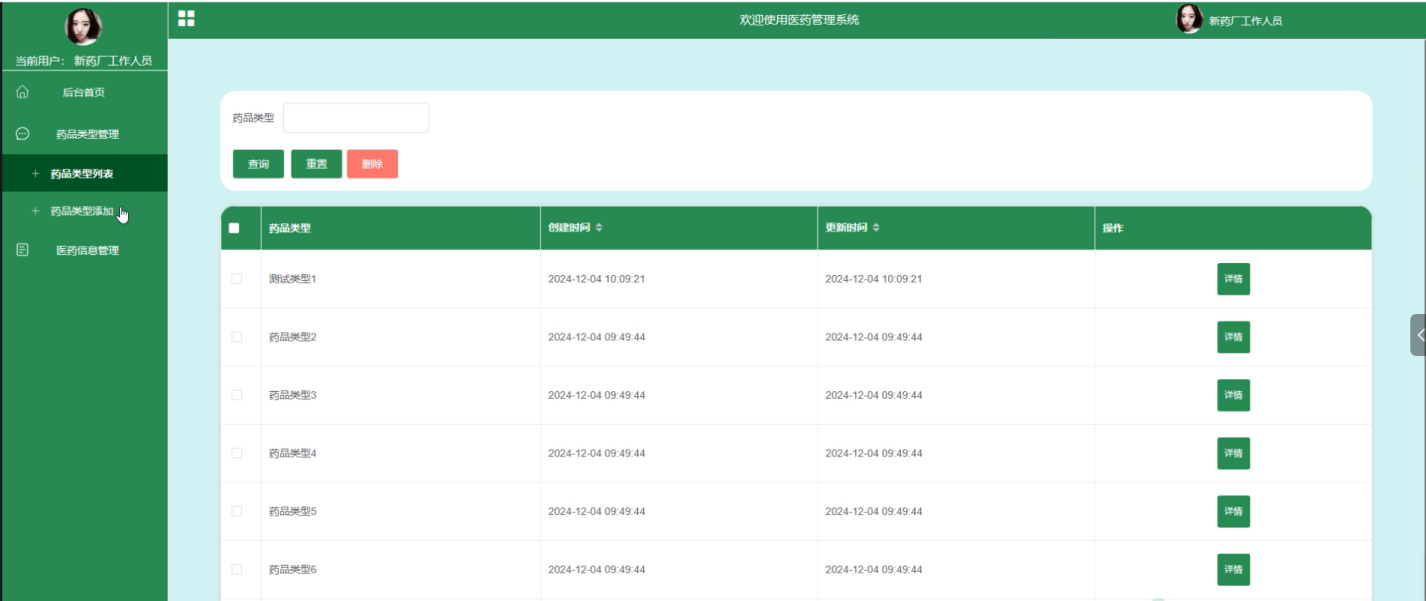 通过用户点击“药品类型列表”可以查看药品类型列表中某个药品类型的详情,能够对列表信息进行查询、重置和删除运行。点击“药品类型添加”进入页面填写药品类型名称信息后点击“提交”即可完成药品类型信息的添加。以药品类型列表为例,其界面如下图4-15所示。