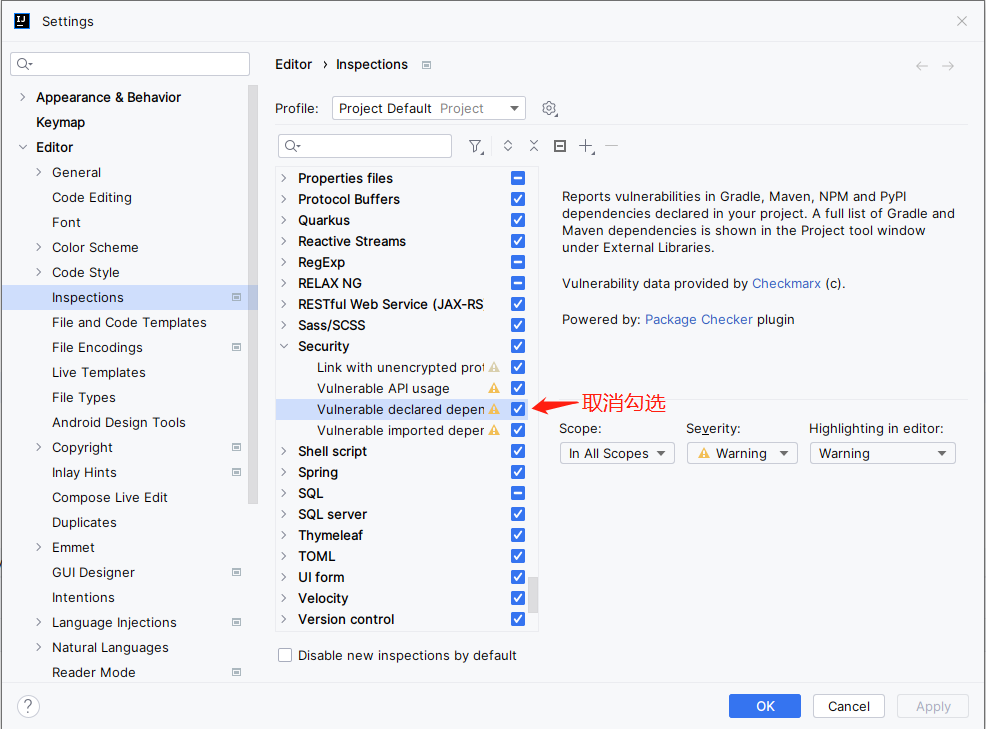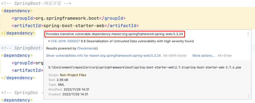 IDEA 2022.1 升级了检测易受攻击的 Maven 和 Gradle 依赖项,并建议修正,通过插件 Package Checker 捆绑到 IDE 中。