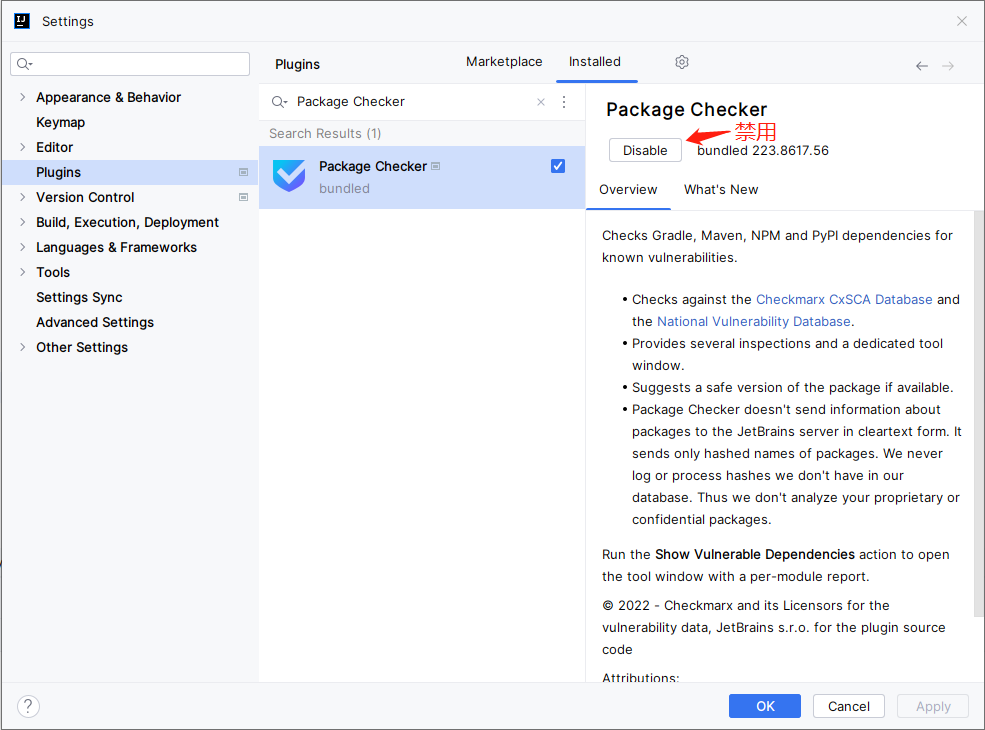 - 卸载 Package Checker 插件,再重启 IDEA 即可。