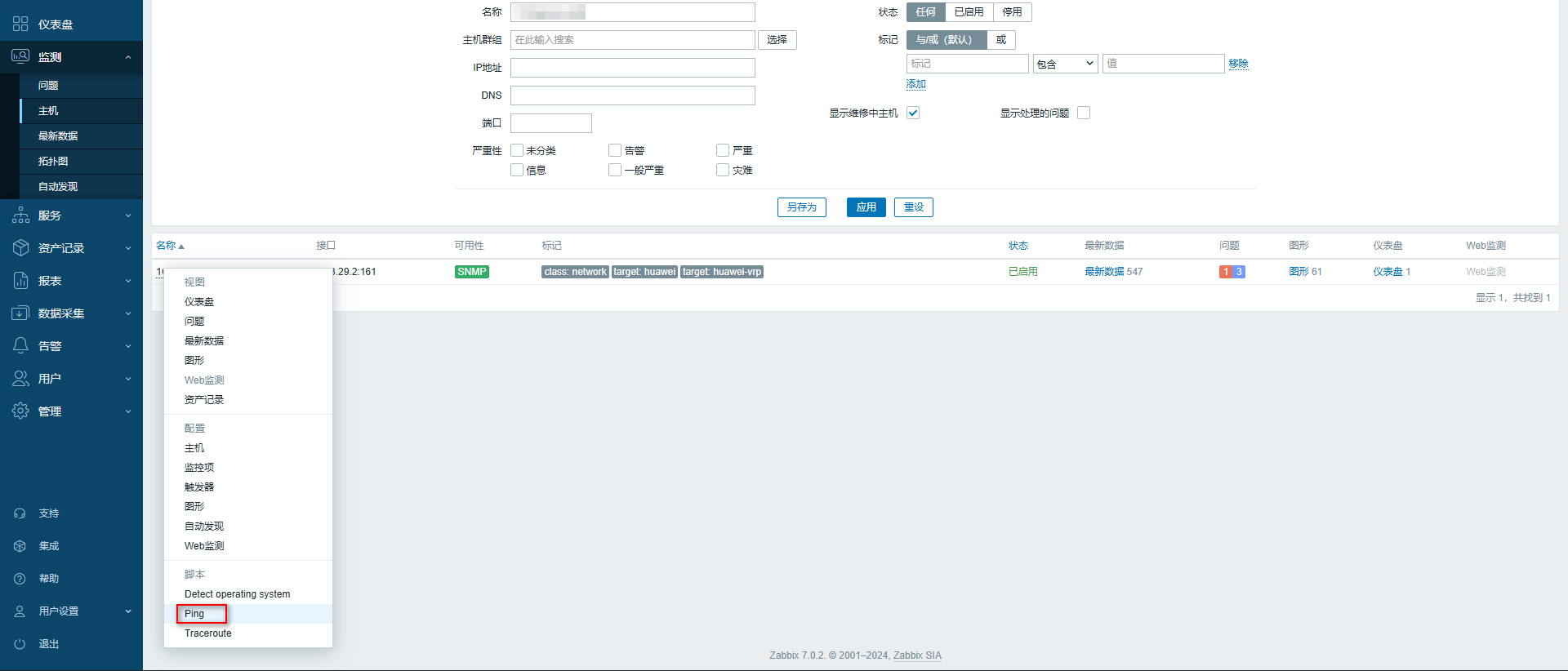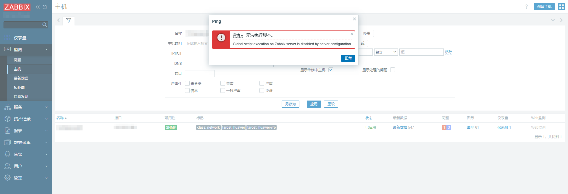 在Zabbix监测的主机中调用脚本Ping进行测试时,提示Global script execution on Zabbix server is disabled by server configuration告警脚本无法执行。