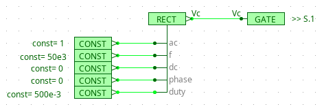 - 找到 Signal/Sink 元件组,使用 Signal Source 作为开关的信号源。波形选择方波 (RECTANGLE),最大幅度值 (amplMAX)、频率 (f)、占空比 (d) 等参数先不填写,勾选 "Use external parameters",这样方便将参数连接到控制器。