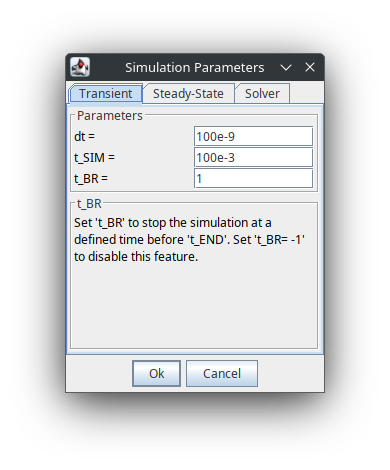 仿真步距 (dt) 为 100 ns,仿真时长 (t_SIM) 为 100 ms,仿真断点 (t_BR) 暂不使用。