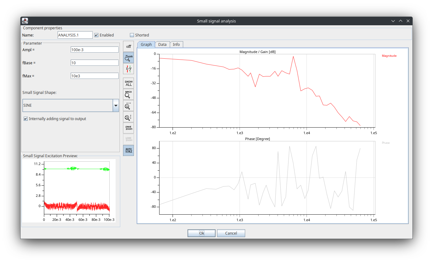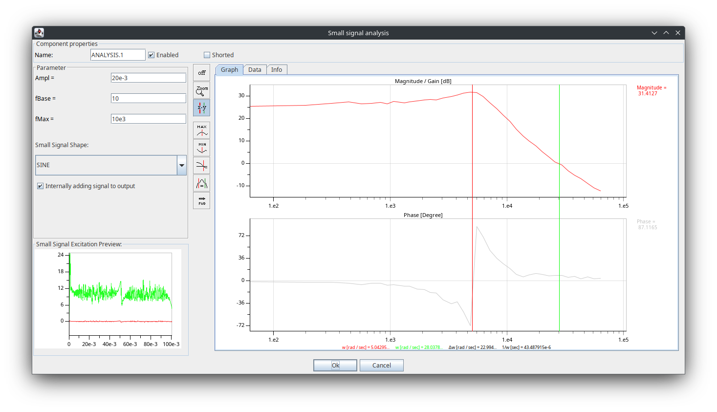 - 找到 Special 元件组,放置 Small Signal Analysis (SSA) 元件,对该电路传递函数 \(G_{vd}(s)\)(即输出电压对占空比的传递函数)进行小信号分析。
