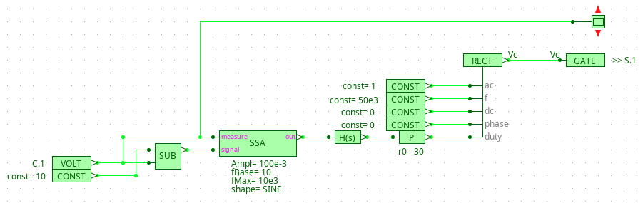 解释一下其中用到的模块:SUB 是减法器,用于计算输出电压与环路设定值之间的差。右上角带红色箭头的元件是波形查看器 (Scope),它被连接到电压测量器上用于查看输出电压。H(S) 是传递函数模块,P 是增益模块 (GAIN),其实也属于传递函数的一部分,单独用来设置增益。P 模块设置为 30,H(S) 模块设置两个极点一个零点: