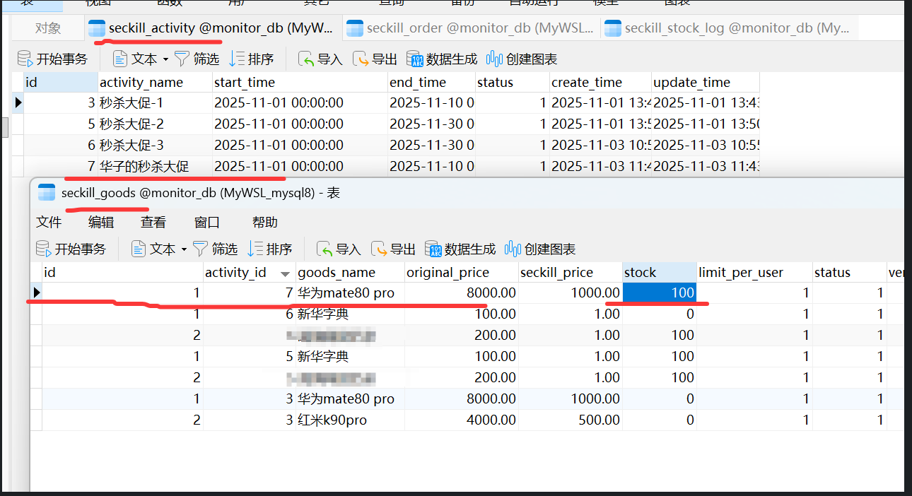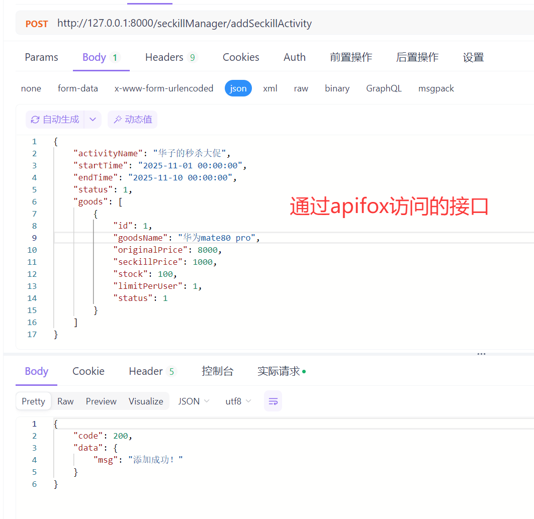 {"activityName": "华子的秒杀大促","startTime": "2025-11-01 00:00:00","endTime": "2025-11-10 00:00:00","status": 1,"goods": [{"id": 1,"goodsName": "华为mate80 pro","originalPrice": 8000,"seckillPrice": 1000,"stock": 100,"limitPerUser": 1,"status": 1}]