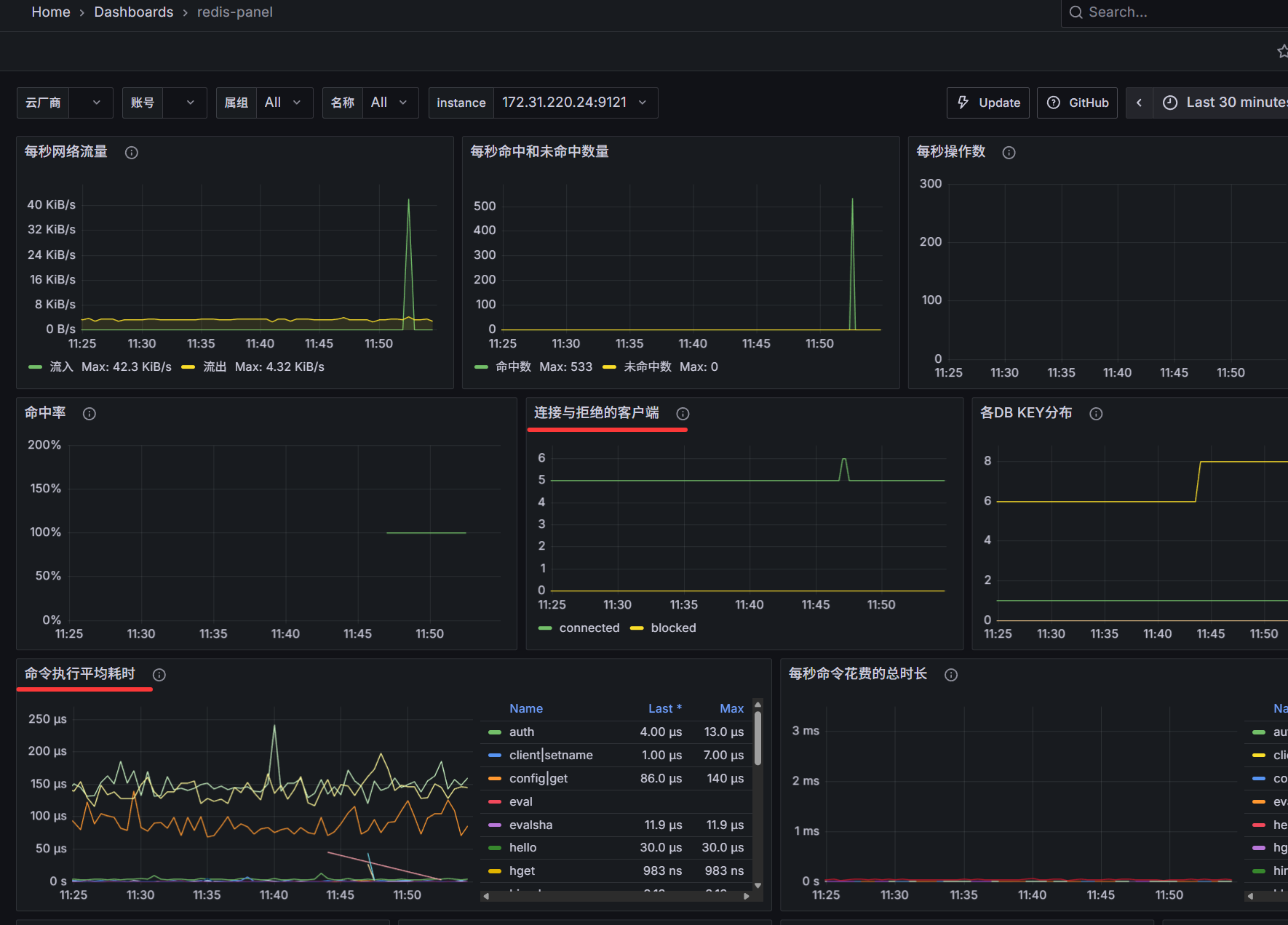 命令执行平均耗时集中在 50–200 μs,命令执行整体高效,无明显慢命令拖垮性能
