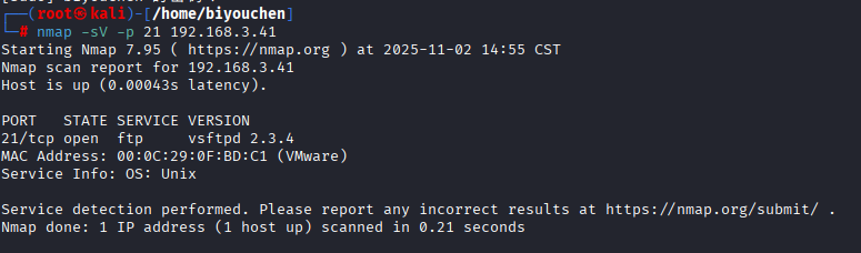 通过命令nmap -sV -p 21 192.168.3.41扫描靶机的21端口,查看该端口是否开启以及其上运行的服务与版本。该端口开放,且运行的是vsftpd 2.3.4。如图15所示: