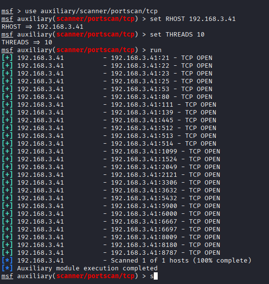 use auxiliary/scanner/portscan/tcp #TCP端口扫描模块 set RHOSTS 192.168.3.41 #设置目的IP set THREADS 10 #并发线程,提升扫描速度 run