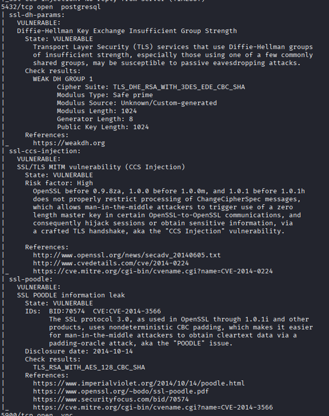 对于5432端口的PostgreSQL数据库存在Diffie-Hellman密钥交换强度不足,CCS注入漏洞以及POODLE漏洞。这些漏洞使得攻击者能够解密数据库通信,劫持TLS会话,最终解密数据。如图13所示: