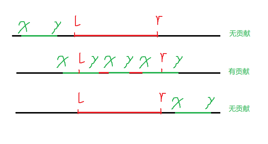 当 \(y < l\) 或者 \(x > r\) 的时候原区间不在查询区间的覆盖范围内,此时无贡献。如下图。