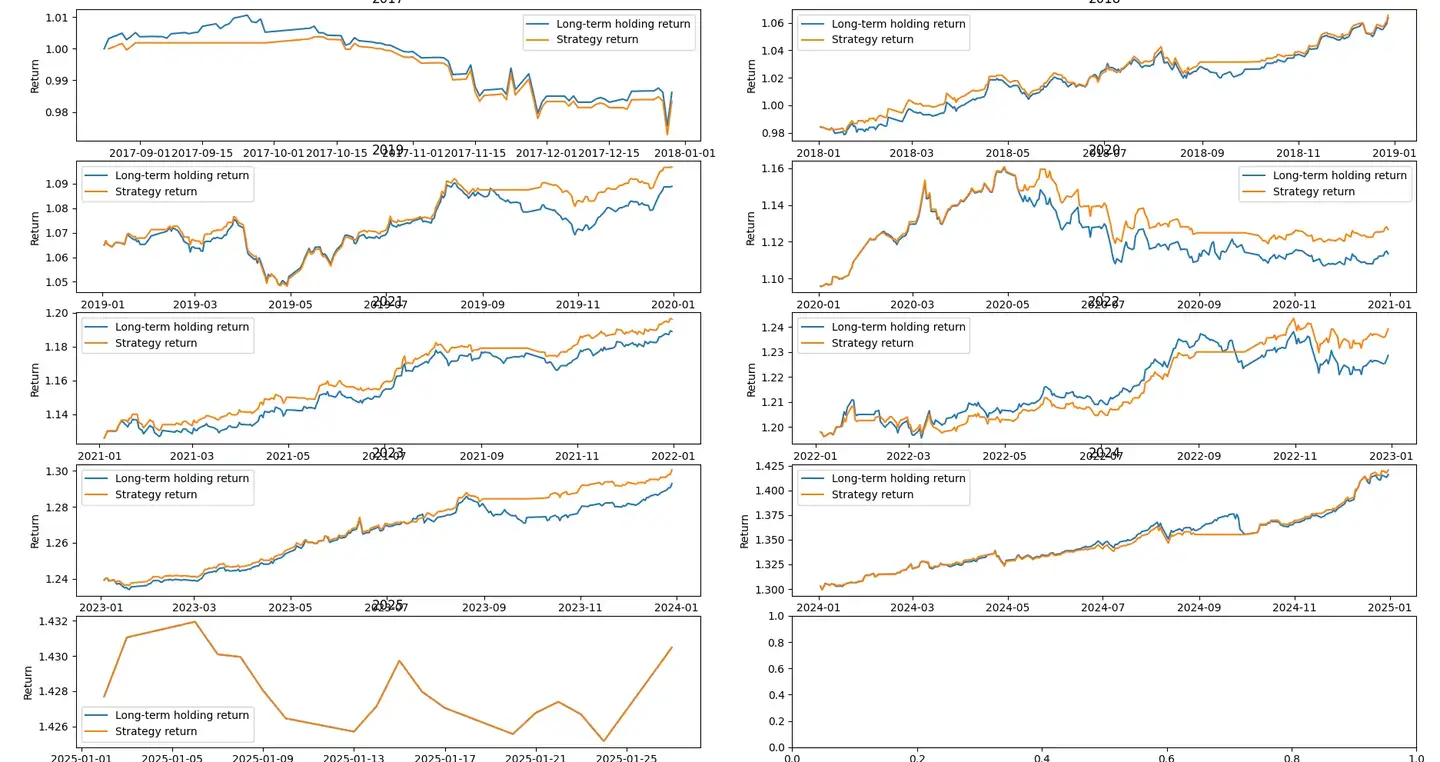 ts_code='511260.SH' # 十年期国债 start_date='20170101' end_date='20250131' # 一直持有 ### Holding Return: 37.22%, Total Holding Days: 1803 # 去掉11/18/25号,去掉9月 ### Overall Return: 43.05%, Holding Days: 1473 # 去掉9月 ### Overall Return: 39.95%, Holding Days: 1641 #去掉11/18/25号 ### Overall Return: 40.43%, Holding Days: 1617 # 去掉11号,去掉9月 ### Overall Return: 41.16%, Holding Days: 1585