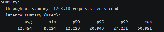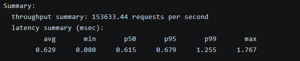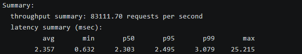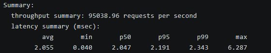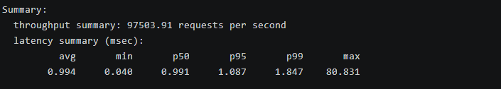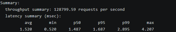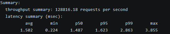 ====== PING_INLINE ======throughput summary: 121153.38 requests per secondlatency summary (msec):avg min p50 p95 p99 max1.630 0.240 1.615 1.743 3.111 4.103====== PING_MBULK ======throughput summary: 128816.18 requests per secondlatency summary (msec):avg min p50 p95 p99 max1.502 0.224 1.487 1.623 2.863 3.855====== SET ======throughput summary: 90826.52 requests per secondlatency summary (msec):avg min p50 p95 p99 max2.174 0.840 2.135 2.279 2.871 22.015====== GET ======throughput summary: 124781.63 requests per secondlatency summary (msec):avg min p50 p95 p99 max1.567 0.192 1.567 1.743 2.799 4.111====== INCR ======throughput summary: 110901.62 requests per secondlatency summary (msec):avg min p50 p95 p99 max1.762 0.592 1.751 1.919 2.055 20.751====== LPUSH ======throughput summary: 83111.70 requests per secondlatency summary (msec):avg min p50 p95 p99 max2.357 0.632 2.303 2.495 3.079 25.215====== RPUSH ======throughput summary: 86798.02 requests per secondlatency summary (msec):avg min p50 p95 p99 max2.254 0.064 2.215 2.407 2.863 28.607====== LPOP ======throughput summary: 97304.66 requests per secondlatency summary (msec):avg min p50 p95 p99 max2.001 0.392 1.983 2.071 2.295 26.655====== RPOP ======throughput summary: 95038.96 requests per secondlatency summary (msec):avg min p50 p95 p99 max2.055 0.040 2.047 2.191 2.343 6.287====== SADD ======throughput summary: 128799.59 requests per secondlatency summary (msec):avg min p50 p95 p99 max1.520 0.520 1.487 1.687 2.895 4.207====== HSET ======throughput summary: 95093.20 requests per secondlatency summary (msec):avg min p50 p95 p99 max2.054 0.064 2.023 2.215 2.847 27.647====== SPOP ======throughput summary: 137703.11 requests per secondlatency summary (msec):avg min p50 p95 p99 max1.431 0.176 1.431 1.551 2.559 4.247====== ZADD ======throughput summary: 133244.50 requests per secondlatency summary (msec):avg min p50 p95 p99 max1.451 0.128 1.439 1.711 2.799 4.447====== ZPOPMIN ======throughput summary: 147928.98 requests per secondlatency summary (msec):avg min p50 p95 p99 max1.329 0.024 1.279 1.599 2.447 4.287====== LPUSH (needed to benchmark LRANGE) ======throughput summary: 81566.07 requests per secondlatency summary (msec):avg min p50 p95 p99 max2.397 0.112 2.359 2.495 3.159 16.095====== LRANGE_100 (first 100 elements) ======throughput summary: 10568.59 requests per secondlatency summary (msec):avg min p50 p95 p99 max7.292 0.160 7.063 12.719 14.719 25.983====== LRANGE_300 (first 300 elements) ======throughput summary: 3512.33 requests per secondlatency summary (msec):avg min p50 p95 p99 max9.134 0.208 8.599 17.743 22.351 41.023====== LRANGE_500 (first 500 elements) ======throughput summary: 2127.96 requests per secondlatency summary (msec):avg min p50 p95 p99 max11.157 0.224 10.871 19.455 23.743 52.991====== LRANGE_600 (first 600 elements) ======throughput summary: 1763.18 requests per secondlatency summary (msec):avg min p50 p95 p99 max12.494 0.224 12.223 20.943 27.231 60.991====== MSET (10 keys) ======throughput summary: 18559.42 requests per secondlatency summary (msec):avg min p50 p95 p99 max10.716 0.120 4.303 6.927 63.519 3000.319====== XADD ======throughput summary: 66511.48 requests per secondlatency summary (msec):avg min p50 p95 p99 max2.977 0.072 2.615 2.823 3.775 926.719