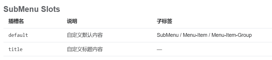default插槽:这是一个“容器插槽”。组件库已经定义好了这个位置允许放入哪些完整的子组件(如SubMenu,Menu-Item)。您直接把这些子组件像普通HTML标签一样放入即可,无需使用<template #default>。 -