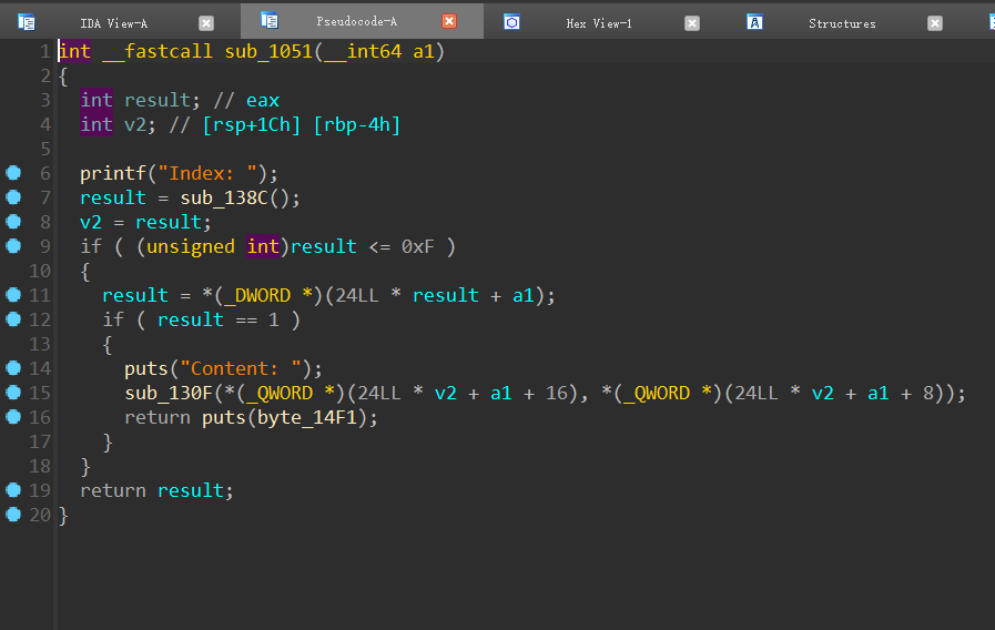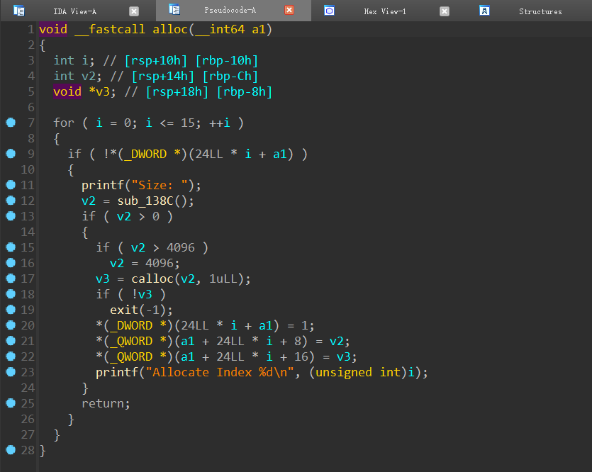 检查alloc函数,可以通过20-22行推测堆控制结构如下(数字代表字节)