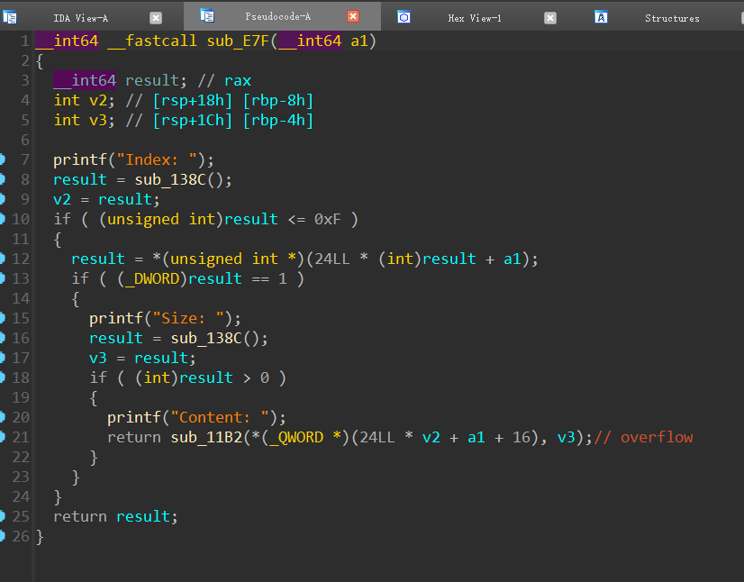 检查fill函数,发现输入的内容长度可以控制,存在堆溢出漏洞