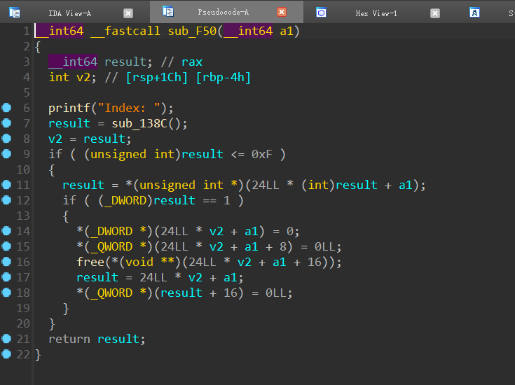 我们倒推思路,要想泄露libc基址,肯定是要利用dump函数。然后一个最常见的方法就是unsorted bin泄露,也就是当unsorted bin中只有一个chunk时,其fd和bk指针都会指向一个和libc基址偏移量固定的地址。这个时候利用dump函数把这个地址dump出来就实现了泄露
