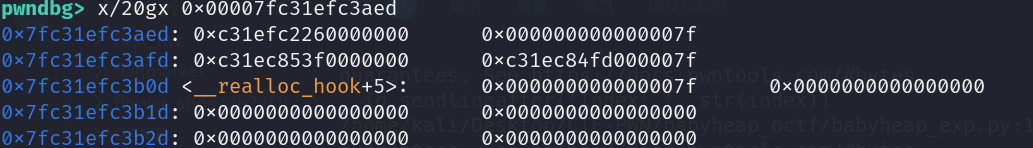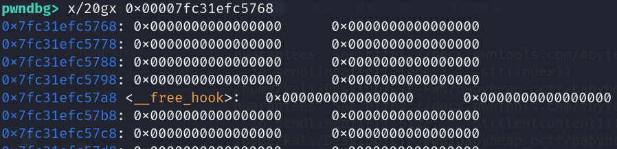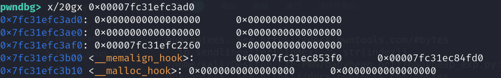 我们需要过前面提到的size的检查,所以需要在hook的上面(更低地址)有一个能满足fake_chunk大小的字节(人话就是需要一个0x7x x为任意字,或者0x6x 0x5x这种fastbin范围里面的)