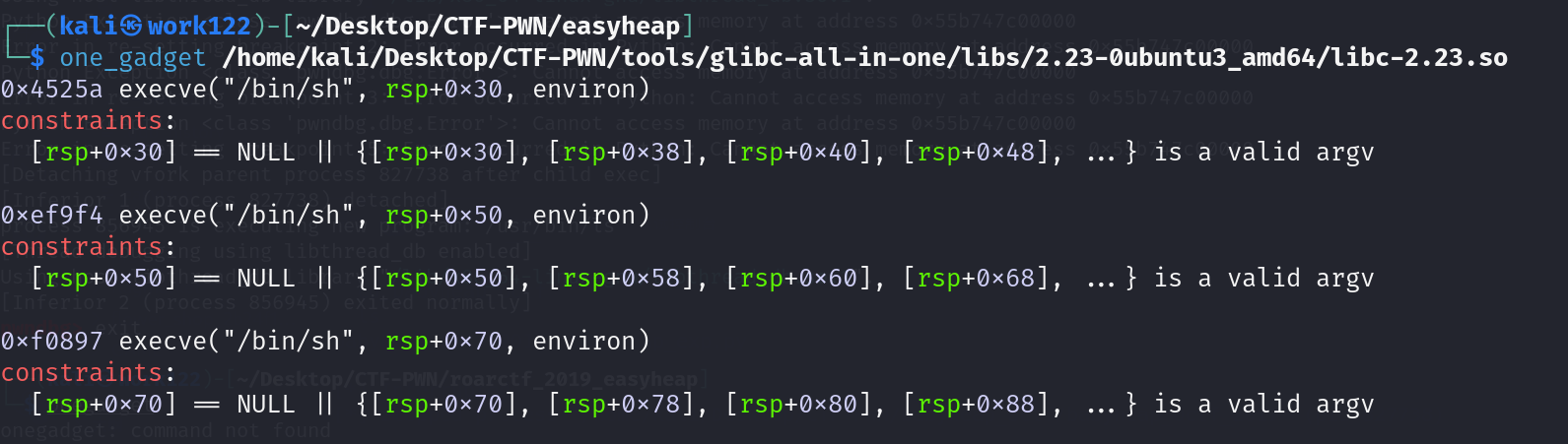 然后用工具找one-gadget地址(这里我的环境又和远程不一样)