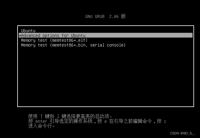 1.开机界面长按shitf键,进入grub,并选择Advanced options for ubuntu,按下回车