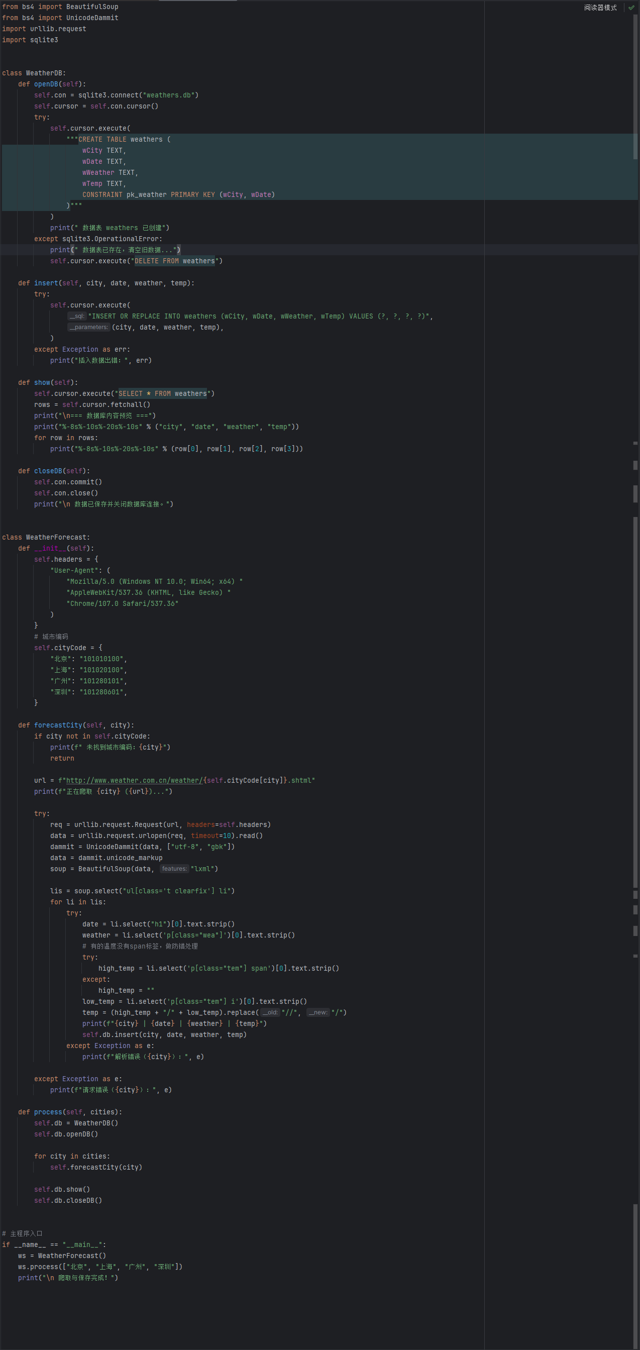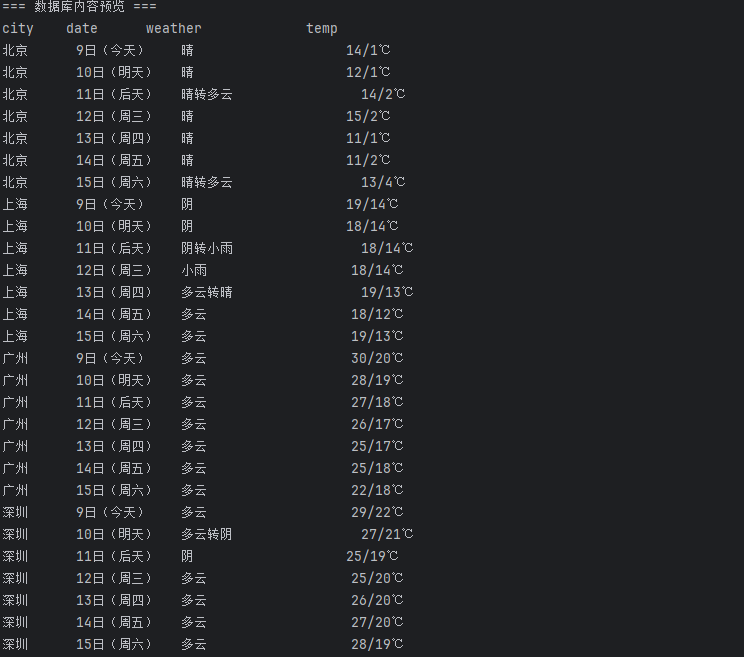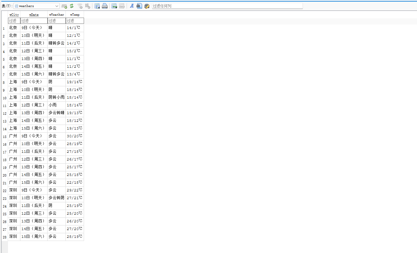 要求:在中国气象网(http://www.weather.com.cn)给定城市集的7日天气预报,并保存在数据库。